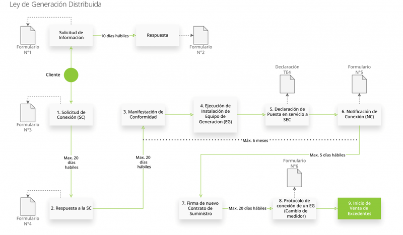 El tiempo requerido para todo el trámite de conexión dependerá de varios factores. Entre los principales se encuentran el tiempo requerido para la instalación del sistema de generación, el tiempo requerido para adaptar las redes de distribución (de ser necesario) y los tiempos asociados al intercambio de información entre el cliente y la compañía eléctrica.
